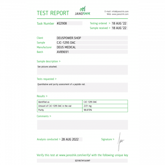 WHAT IS THE 30-AMINO ACID TETRASUBSTITUTED PEPTIDE HORMONE? CJC-1295 DAC HORMONE by Deus Medical is a peptide of the GHRH class, DAC stands for Drug Affinity Complex. This modification significantly increases the compound’s half-life, allowing a single application to maintain high GH and IGF-1 levels for several days.